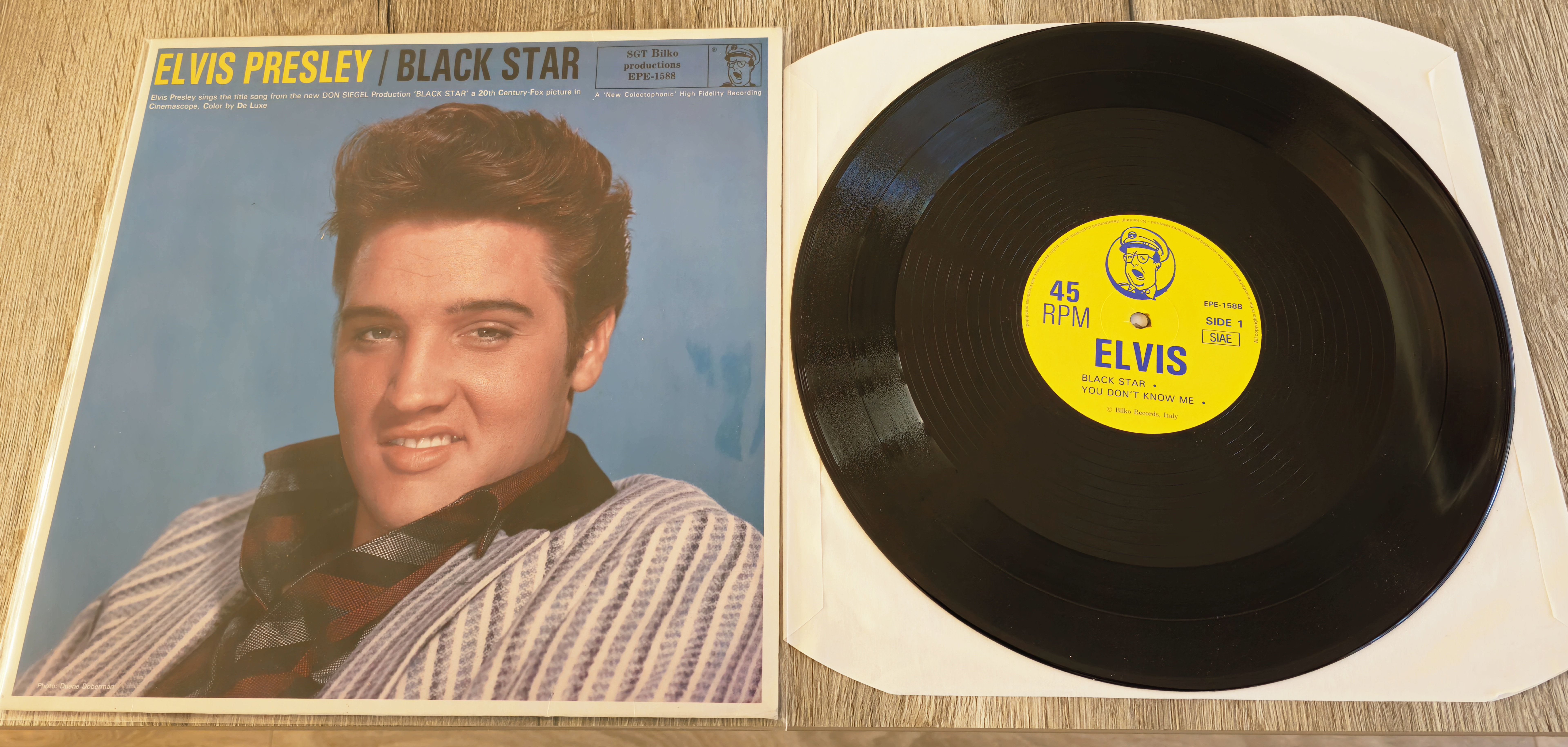 Elvis Presley / Black star. A 12" vinyl, 45 rpm from SGT Bilko productions, released in 1988. It has only 4 tracks. The cover has a beautiful promo photo for Jailhouse Rock. The cover mentions it as "Printed in Italy". Maybe so, but the vinyl is produced by our famous Dutch bootlegger who also designed the sleeve.
