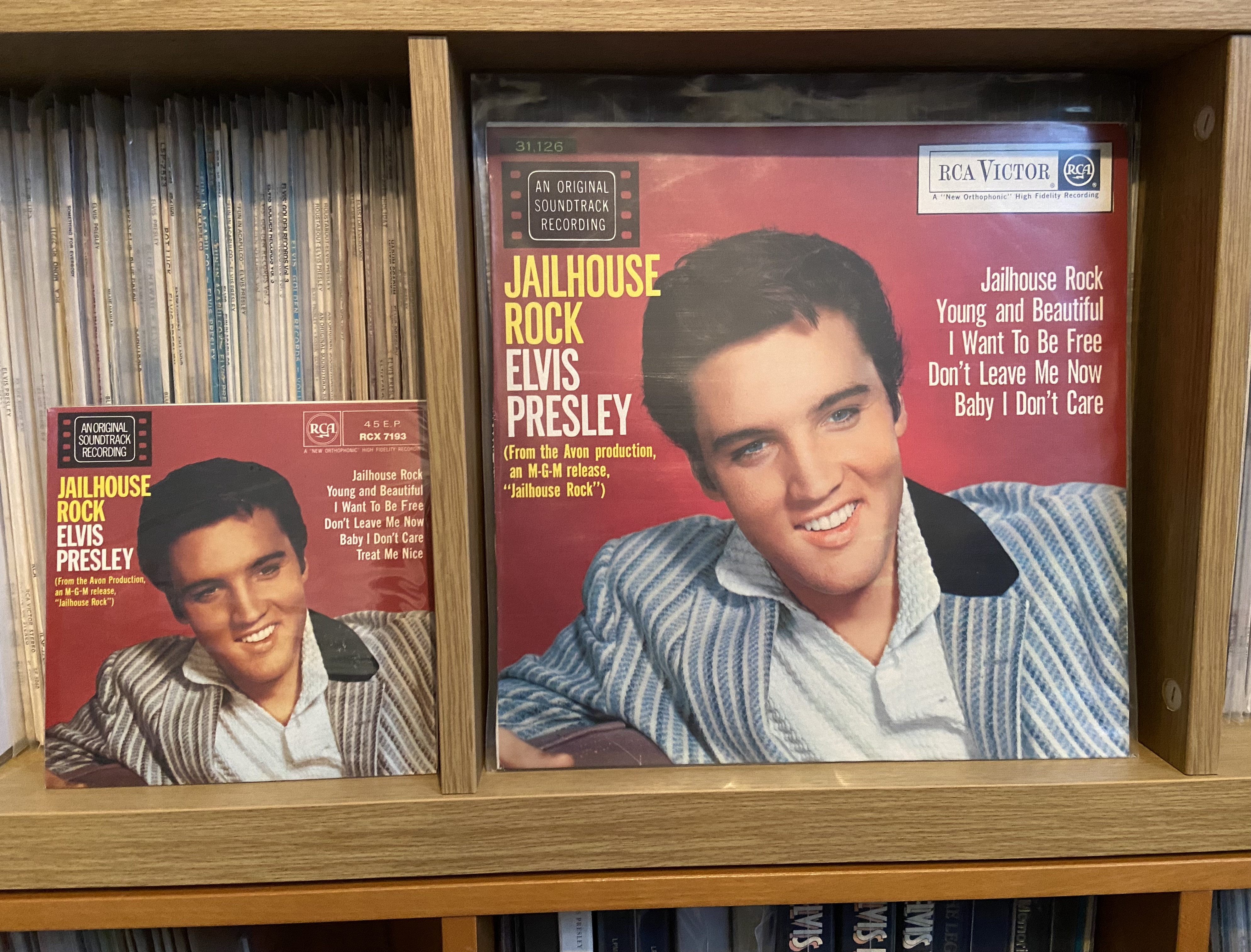 Elvis’s global popularity is what lead to RCA distributors and affiliates pressing records for their own home markets. This lead to many rare pressings being produced and the South African release of the ‘Jailhouse Rock LP ‘ is a typical example of this.
