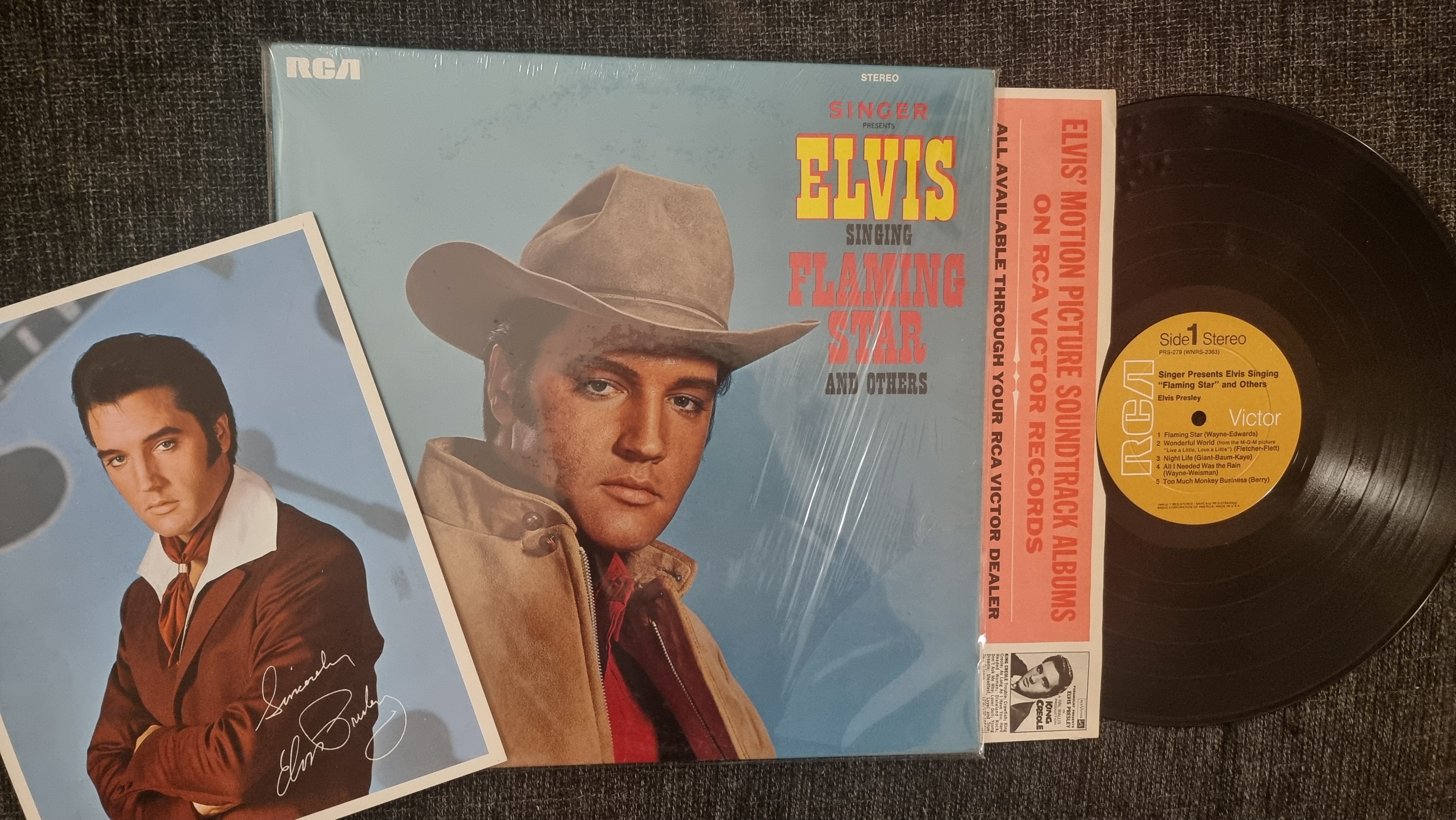 Singer Presents Elvis Singing Flaming Star And Others has a brownish/tan label, probably because it was a sponsored release at the time. The record comes in the standard 21-112-1 40D (red/pink) inner sleeve, which was the standard inner sleeve for 1968, and includes a lovely bonus photo.
