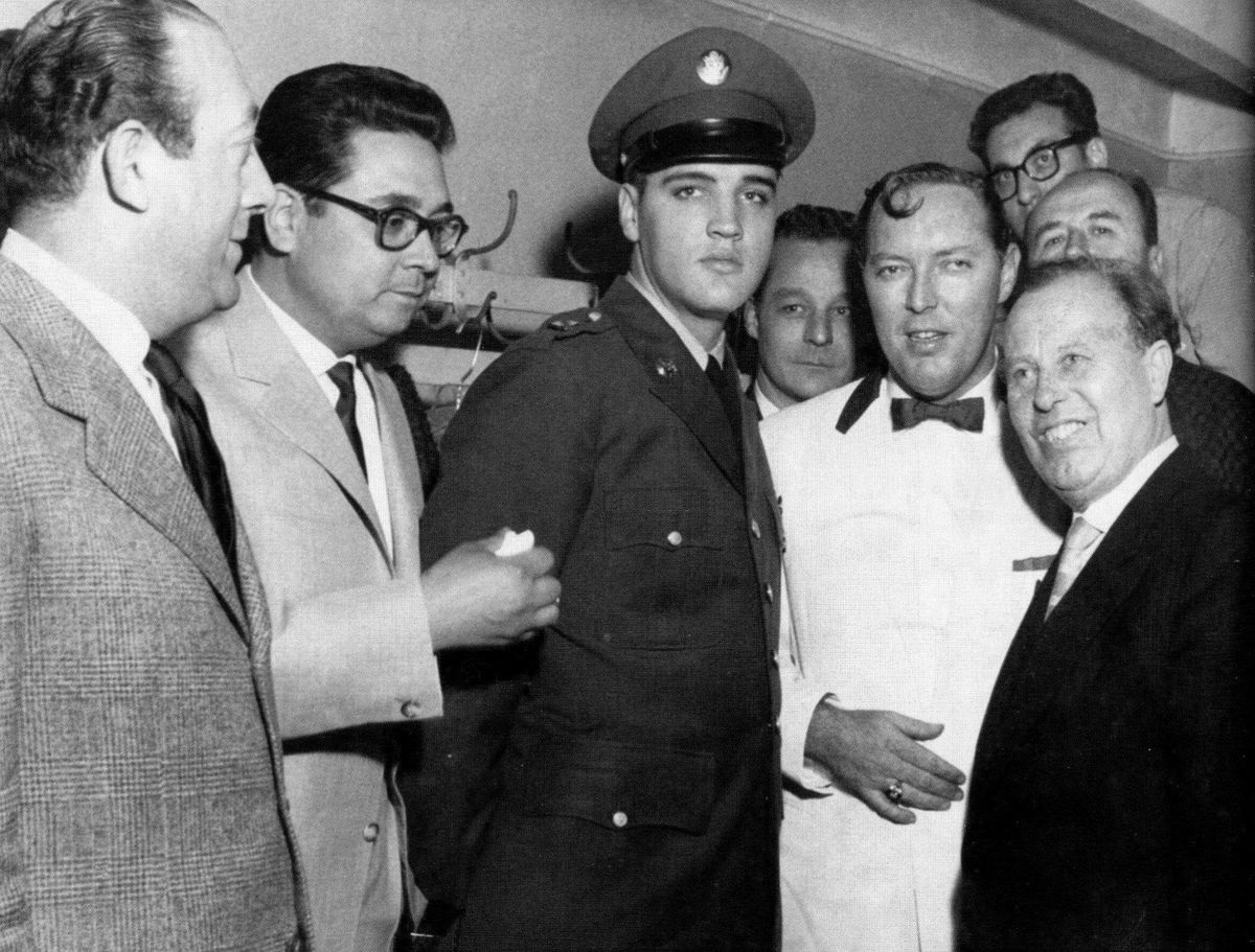 There, none other than Elvis Presley, the handsome shooting star from Tupelo, Mississippi (only 23 years old but already a recording millionaire) watched his friend Bill's concert, moving his hips to the music, which of course the almost 1,100 young spectators in the Universum Theater in N 7 could not have guessed. The U.S. boy had long re-written music history, and given the world songs like 'Heartbreak Hotel', 'Hound Dog', 'Blue Suede Shoes' and 'Love me Tender', all number one hits in the USA. Elvis' sudden visit to Mannheim -- as his biographers have worked out -- coincided with a special phase of his life, marked by major upheavals and many new impressions: Presley had only arrived in Germany three weeks earlier (on October 1st) to move to the U.S. army base in Friedberg to do his military service.
